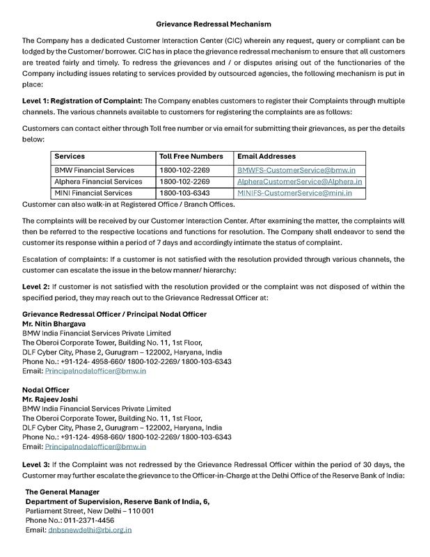 How do I lodge a complaint with BMW India Financial Services?![]()  You may follow the escalation matrix given above.