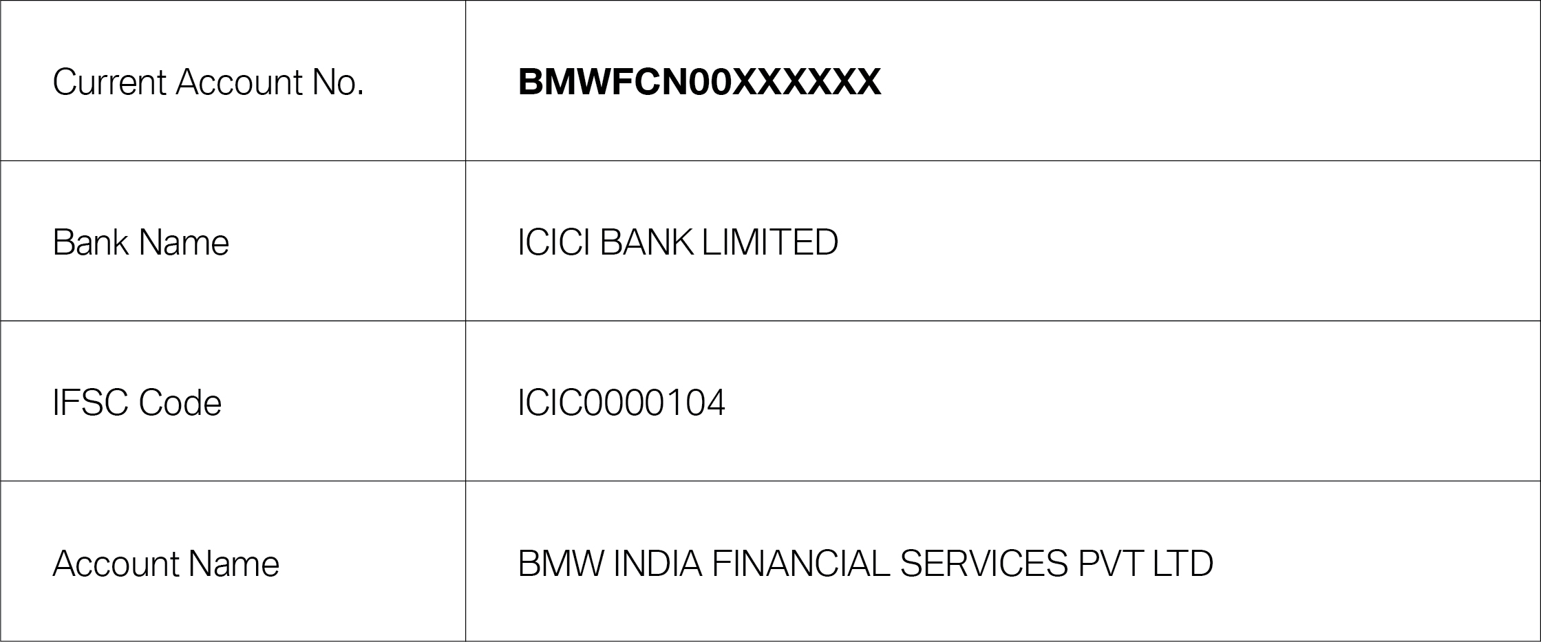 Payment can be made via an electronic transfer or can be credited to the BMW India Financial Services Bank Account through a Cheque/DD deposit.