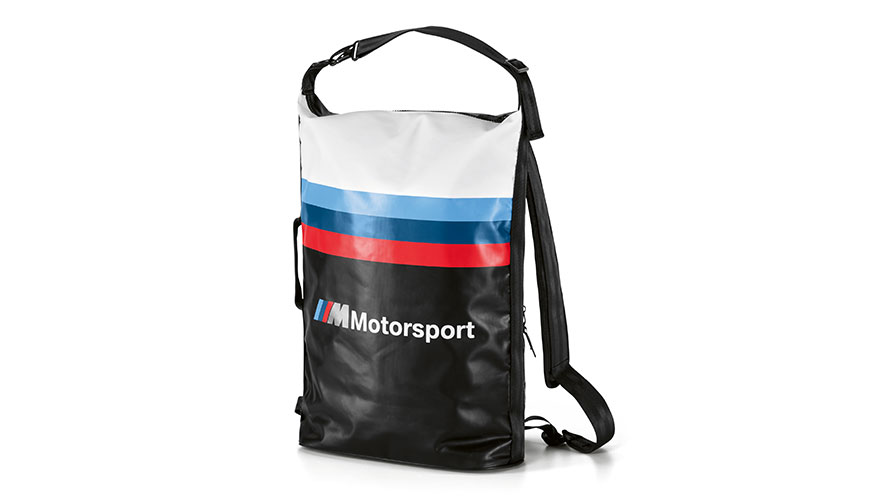 Made from high-quality fabric with details in real leather. Zip-fasteners with embossed BMW M logo and jacquard lining with BMW M logo pattern. With four zipped pockets and front organiser compartment.